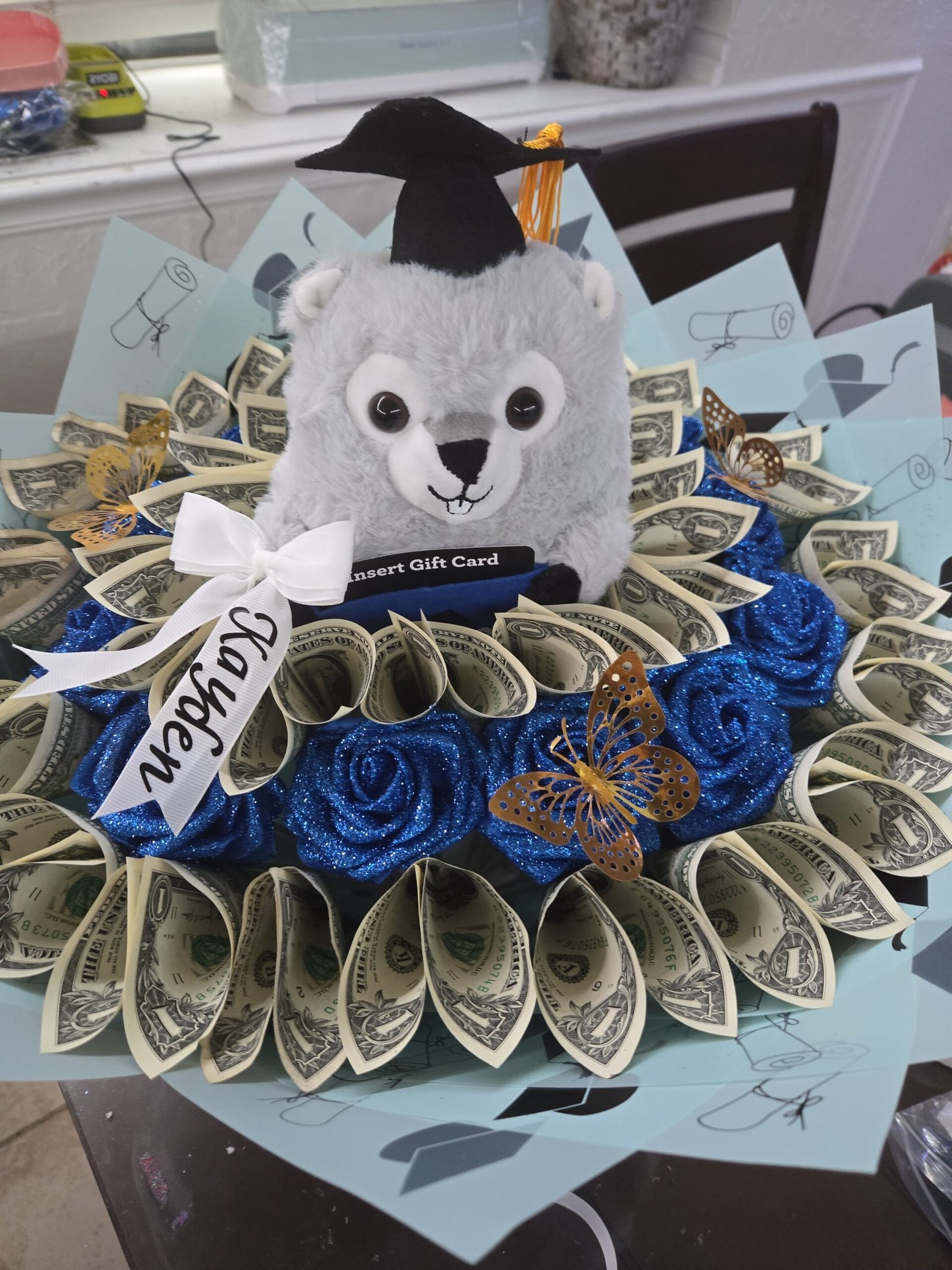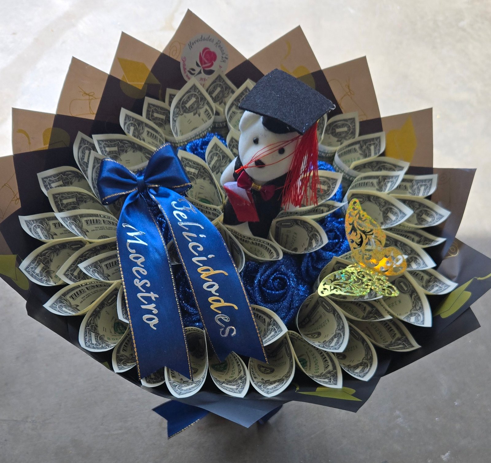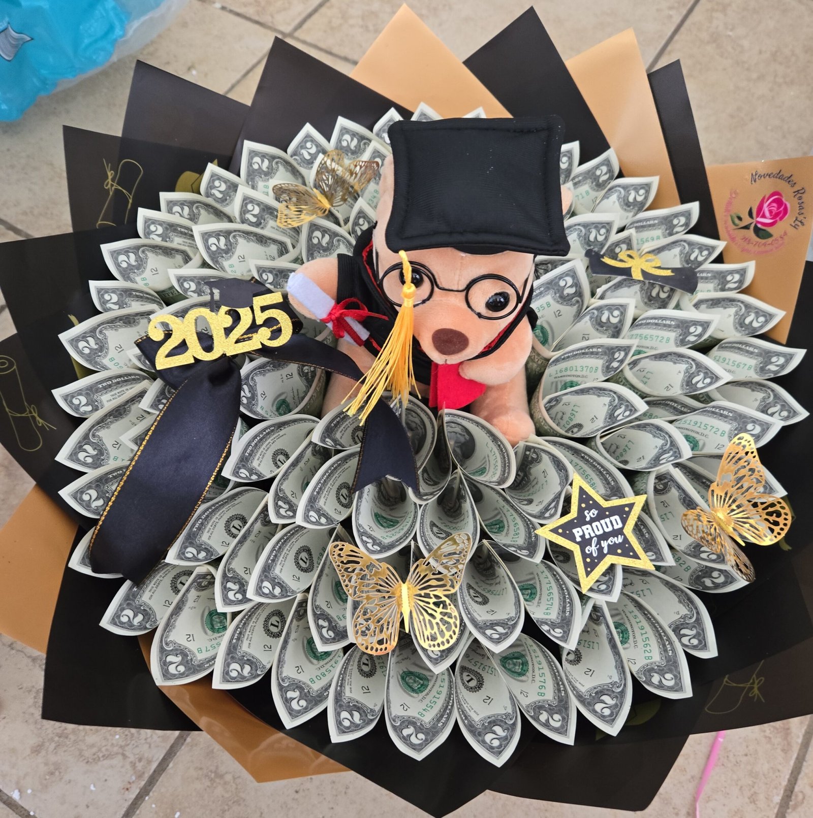 El.precio varia depende la cantidad de dinero que le ponga. lo personalizamos con la frase que gustes, el.peluche que elites y el papel.. puedes mandarme mgs para detalles.. en tu orden