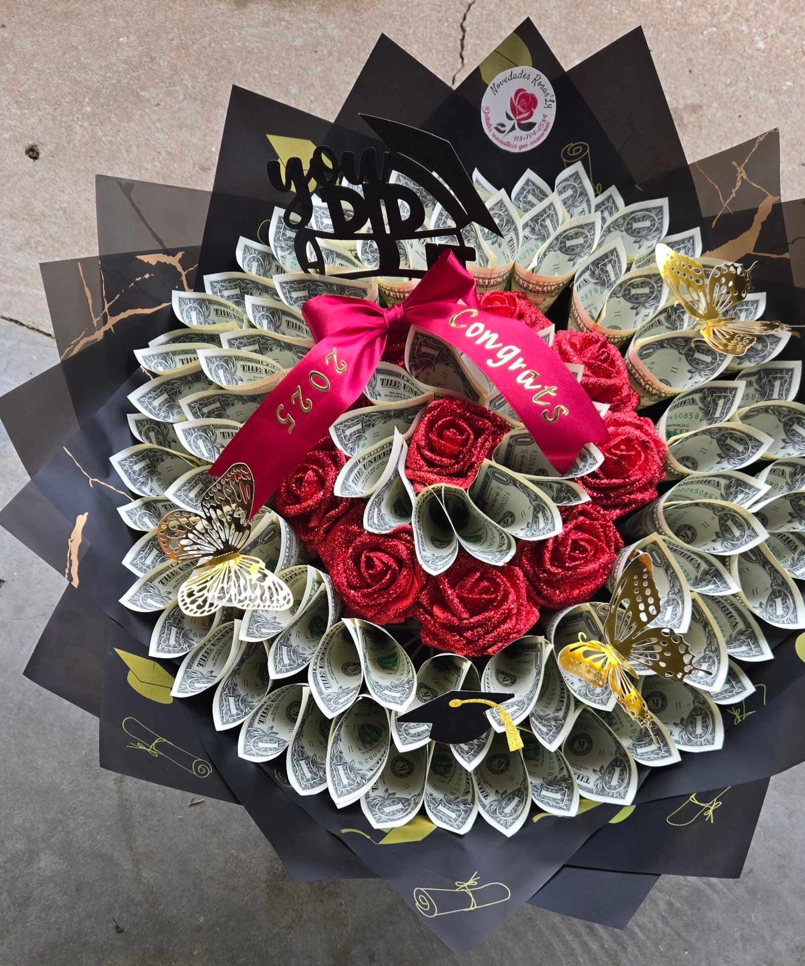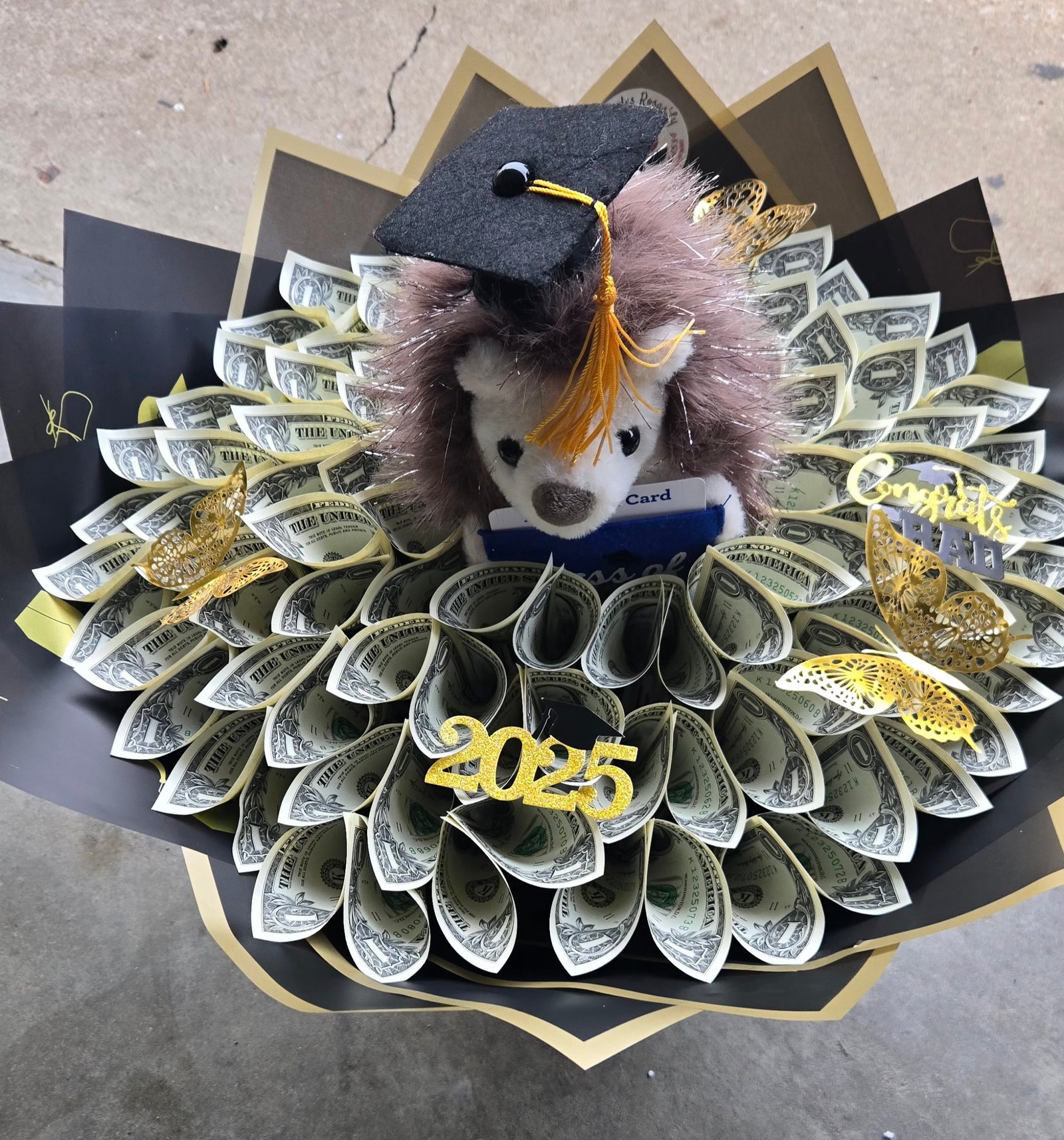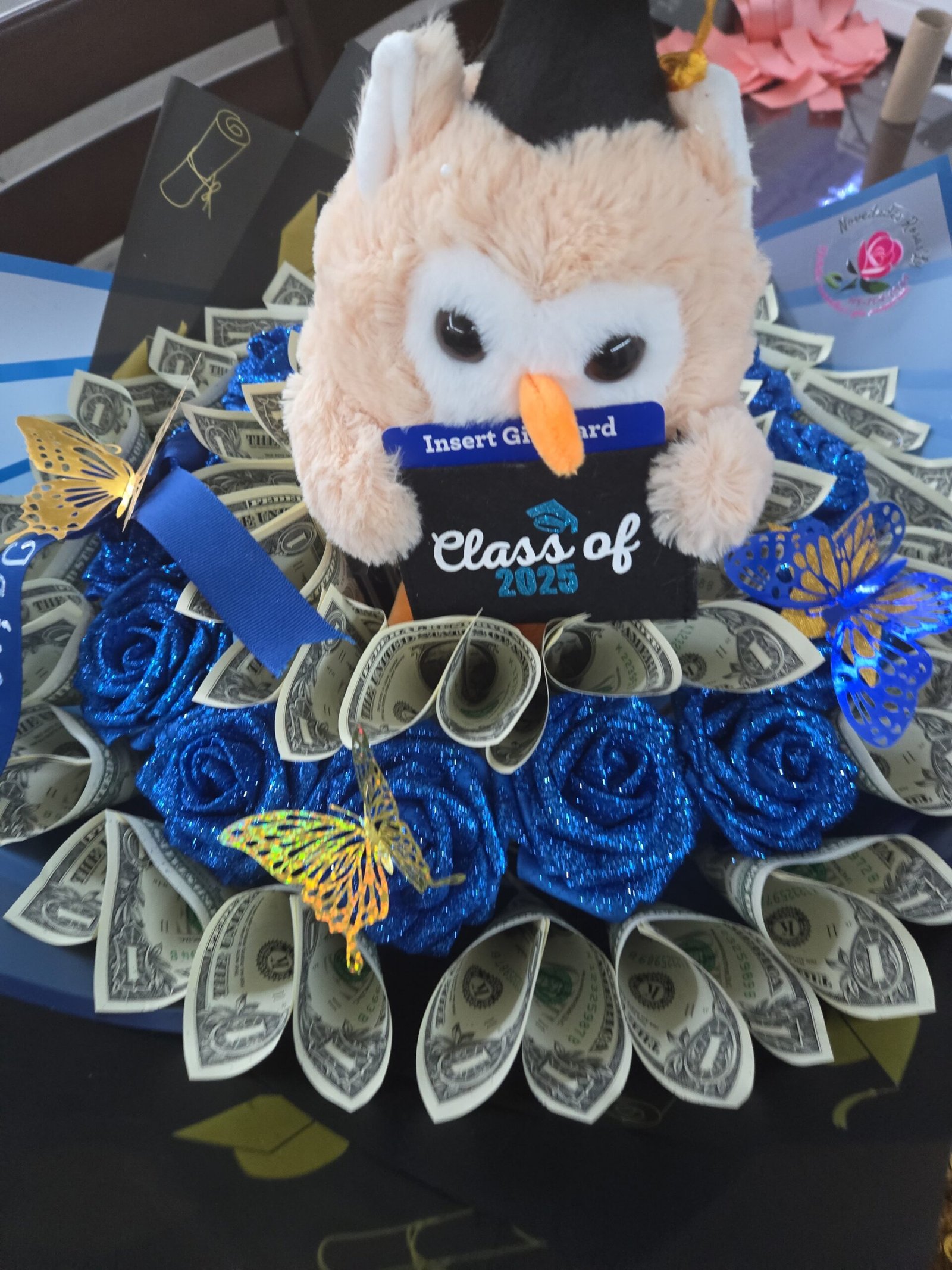 El.precio varia depende la cantidad de dinero que le ponga. lo personalizamos con la frase que gustes, el.peluche que elites y el papel.. puedes mandarme mgs para detalles.. en tu orden